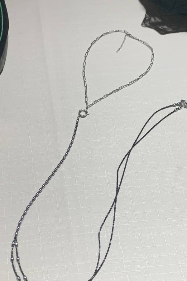 Perles en hématite, en forme de grain de riz et perles grises montées sur un fil câblé.