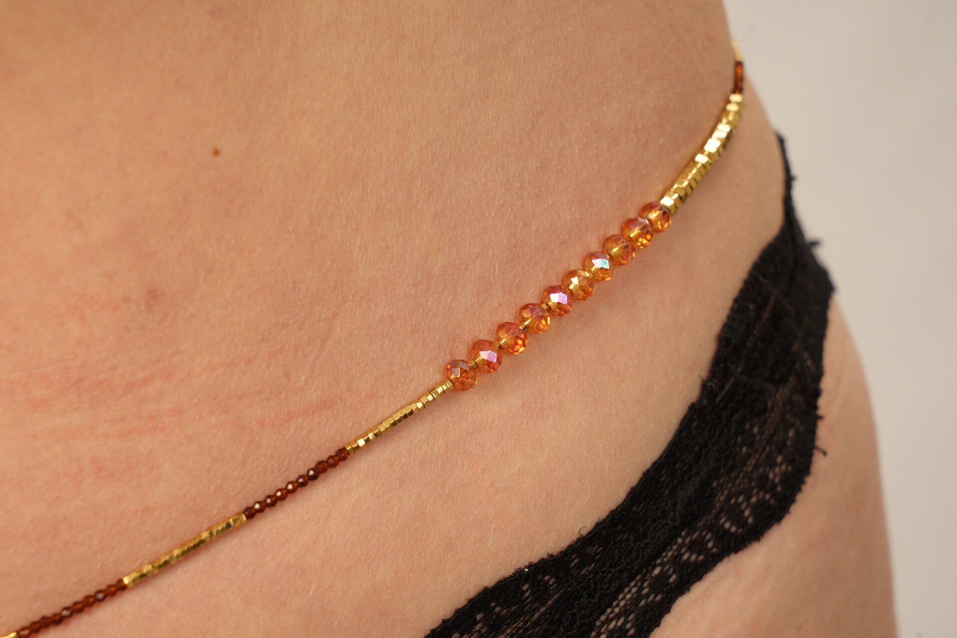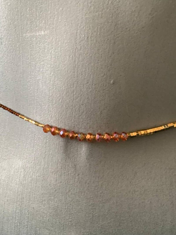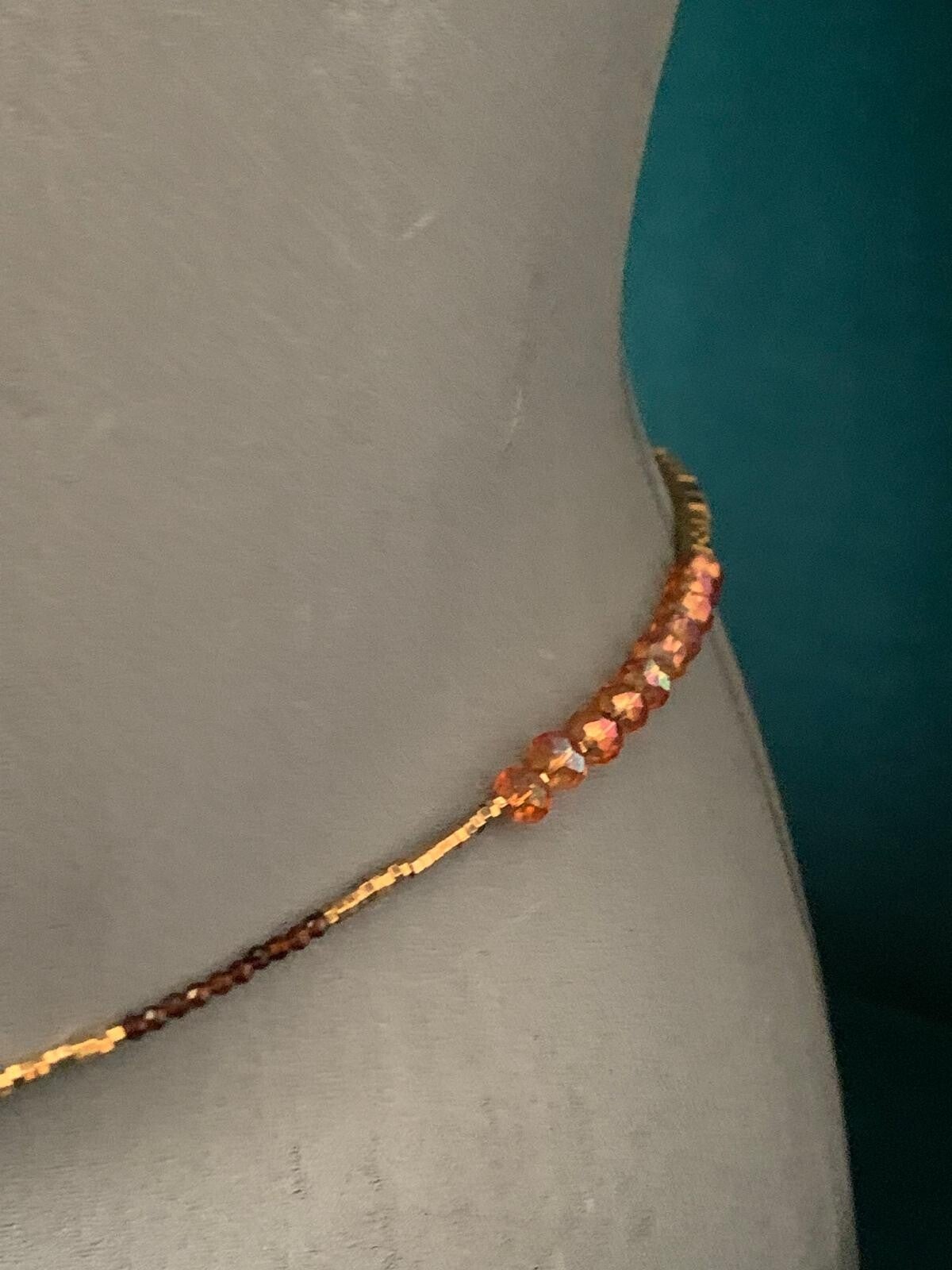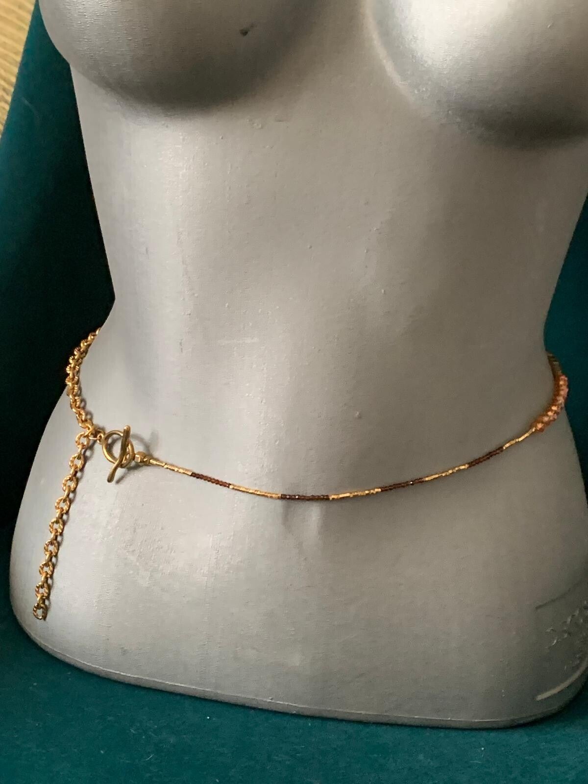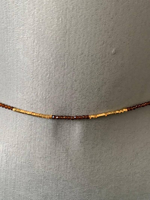 Chaîne de taille perles facettées marron, petites perles hématite dorées, fermoir et chaîne en acier inoxydable.