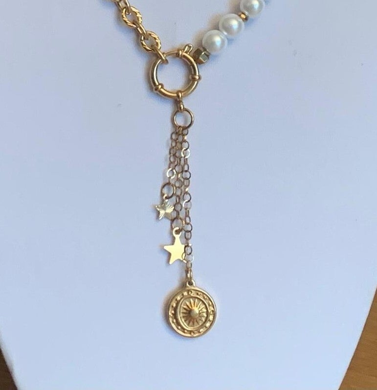 chaîne, fermoir et pendentif en acier inoxydable doré. Celui-ci est composé de 3 chaînettes fines, terminées par 2 étoiles et un charm soleil.