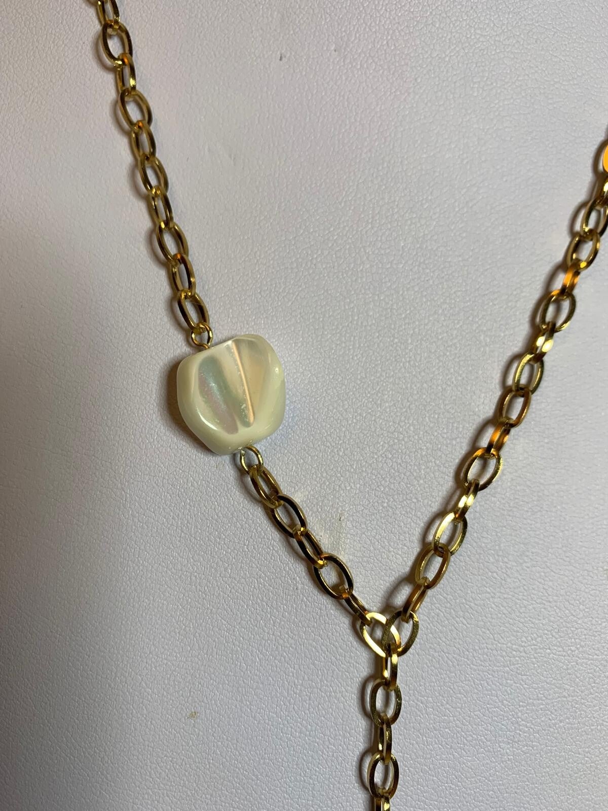 Chaîne en forme d'Y en hématite doré, agrémentée d'une rectangulaire en nacre. Le pendentif se termine par un charm en forme de raie manta.